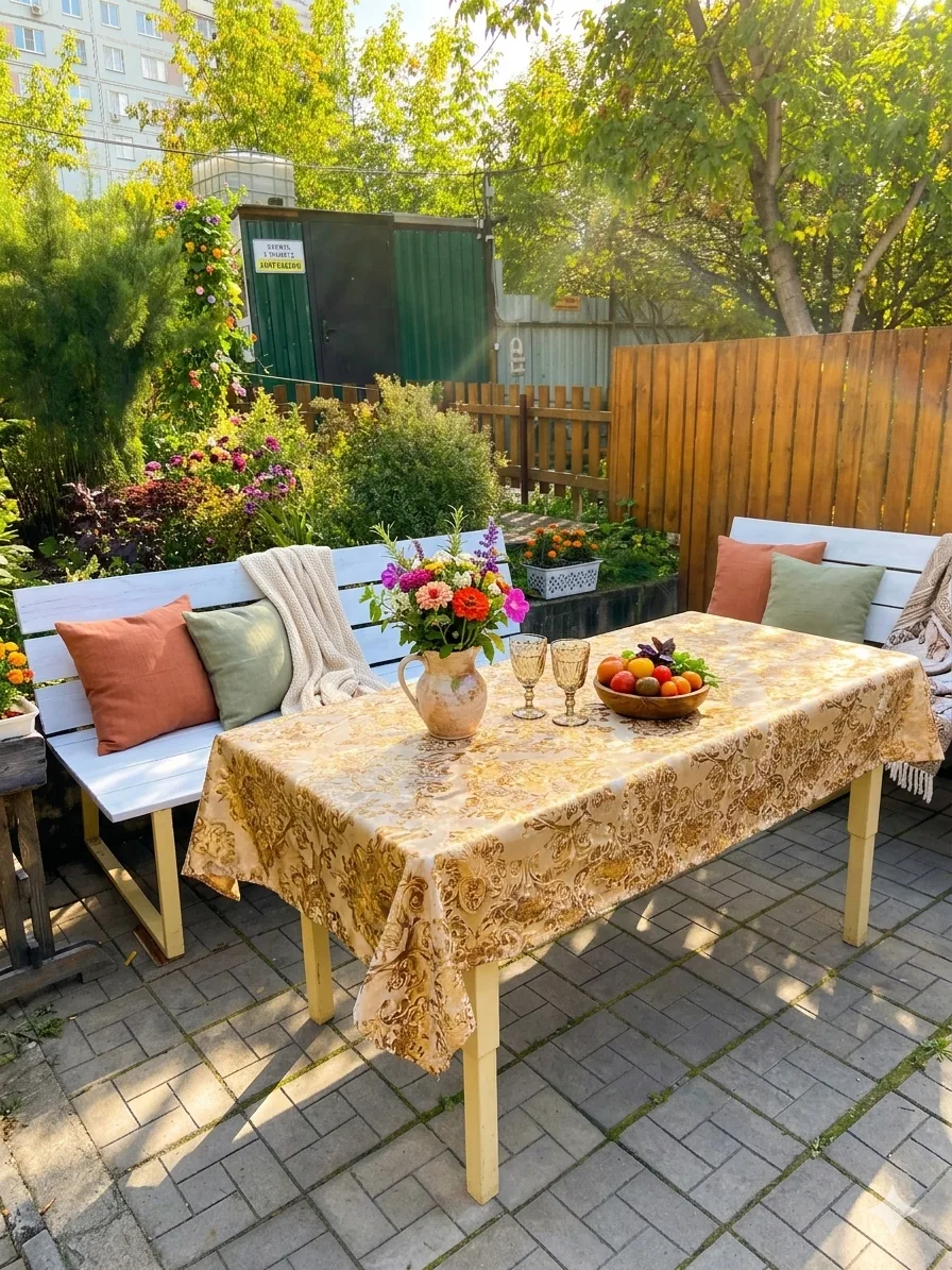 Полная комплектация: Вам не нужно везти с собой полкухни! В беседке есть стол со скатертями, раковина с водой, полотенца, разделочная доска и нож.
